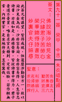 努力必有收获,但并非容易,必须付出心力,才能有所得,就像是读书人一样,努力用功,书中自有颜如玉,书中自有黄金屋,但必须经过辛勤的劳苦,未来功名 皆从书中得来,其中的奥妙,必须细细思量,也就是辛勤用功,才得以功成名就。此签表示没有不劳而获,必须经过一番劳苦,富贵名利才会随之而至 |